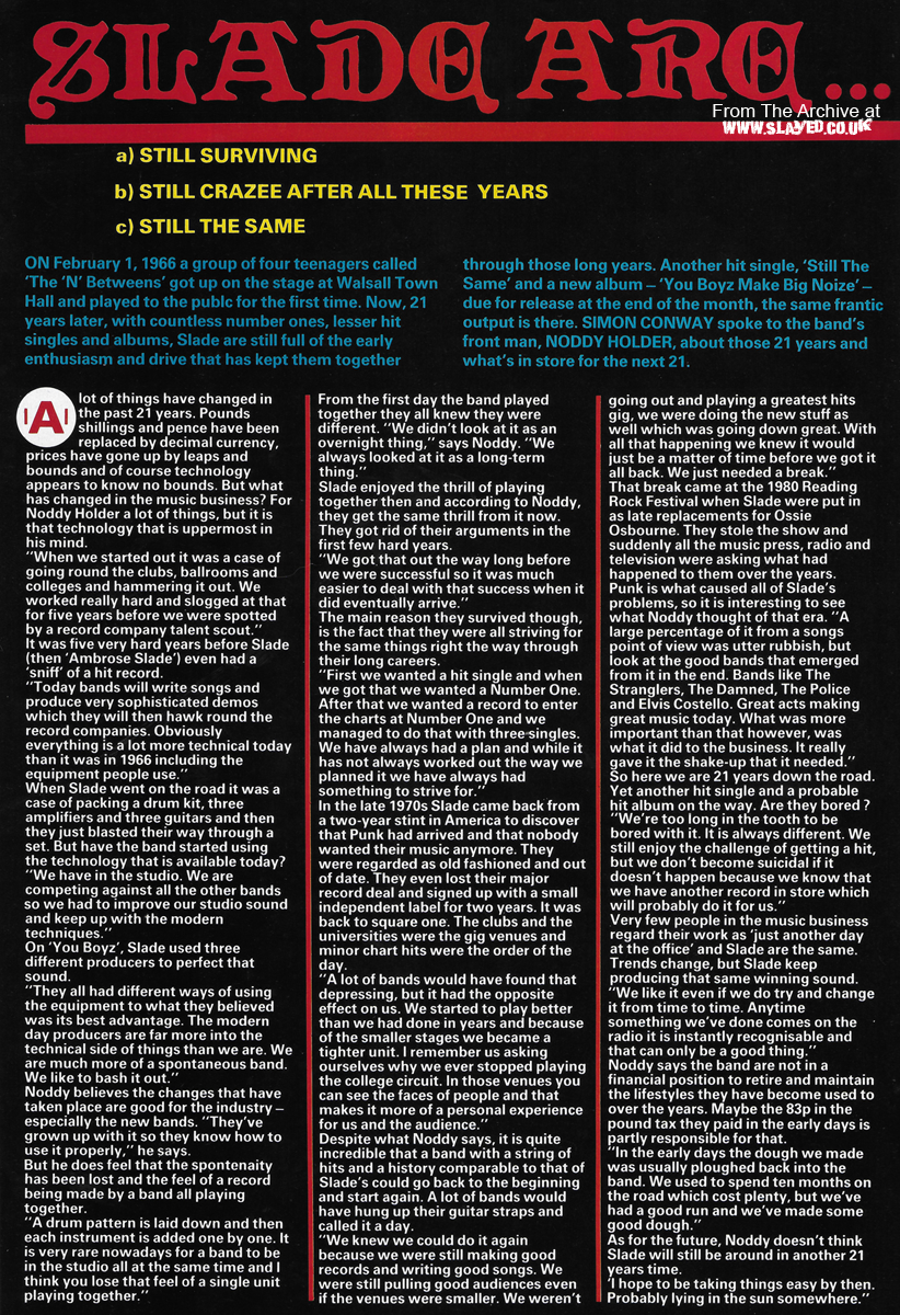 The Wall of Hits compilation is now in the shops, ready for the Christmas market, and should prove something of a pointer to further success. If things go to plan, Noddy and the boys will be in the studio next year working on new material for a mid-year release, and would have then completed the first stage of the new Resurrection. Meeting Noddy Holder and Dave Hill in a London hotel lounge I start by asking them which way things will develop and how do they see the present Slade package. Noddy replies first: "We've always been a rock band, but we have tended to change a bit from album to album. If you listen down the years, you'll find a diverse selection of styles creeping in. We've gone from making out-and-out rockers to soft records with a keyboard feel." Dave cuts in: "We've all got different tastes. Nod might like stuff that I don't and vice versa, but the common link between all the band is the band edge that makes music exciting. We are capable of doing a ballad like EXTREME and THE SCORPIONS have done recently, but our hearts lie in something more up front." Why is it you've kept so quiet on the live circuit? Noddy: "We have taken a long time out, but it was important to do so. We’d reached a stalemate position. There is no point going out touring unless you feel good about it. Playing without the right energy just creates a negative feeling. The main problem with long-lasting bands is they do tend to repeat themselves and often fail to come up with fresh ideas. Every time we've felt this happening to us, we've put the band on hold. It allows us individually to follow other pursuits and means the band is fresh when we get it back together." What kind of things did you get up to? "Dave was doing his own solo stuff, Don's been playing with other people, and Jim’s been doing a lot of production for other acts. I've got my own radio show in the North and the Midlands, playing music from the 70s so there are other things and plenty of life outside Slade." Going back to the early days, what made you adopt a skinhead image, when it was more closely associated with reggae? Dave first: "It did confuse a few people but the image did depict the hard hitting rough sound which we played." Noddy continues: "We did get a lot of backlash from the image, but it did help break us. Later we made it more colourful and people accepted that. We never attracted a skinhead audience. We were always big attractions in the universities and colleges, and it's through constant work there that we got our name. We were about the only band at the time who didn't have long hair. Whatever its down points, the image was at least instant." How does it feel being back in the charts again? Back to Dave: "It does feel odd in a way. I was listening out on Sunday for the chart position. It's like it's all new. When I had my first number one I was 26 and that felt old at the time. I never expected I'd still be around 20 years on." Noddy continues: "In the Sixties you just didn't consider being in a band if you were over 25. It's only now that the whole rock n' roll game has grown up. This is the first time that so-called rock artists who are in their 40s and sometimes 50s are still making records. Video and old film have helped many older bands survive, giving younger audiences a chance to get into things from earlier periods. Wall of Hits is also coming out on video, and that in itself is a sort of history on film." Talking of video and film, leads us onto "Flame" the movie Slade made in the early Seventies. Taking a serious look at the business, the film is far different from any of the BEATLES or ELVIS Ventures before. Picking up some critical acclaim and prayers within the industry, the film wasn't what the young fans expected. Noddy takes up the story: "None of us could act but we got by because the characters were based on ourselves. We weren't too impressed with the original script, so we got the writer and director to come out on the road with us for a few weeks. They soon got a clear picture of life in a band, and the new adaptation was far more real." Dave cuts in: "We passed because we didn't have that many lines to speak." Noddy: "You didn't. I did!" Dave: "Yeah, they took a good look at my acting early on. I heard someone wanted me killed off in the first scene." Noddy: It couldn't have been that bad because Channel 4 showed it on a Friday night sometime back. We didn't want to do a 'Hard Day's Night' thing, so we went for something close to home, having a serious as well as humorous side. The film did show the black side of the business, and in many ways destroyed a lot of myths." Dave again: "The critics were kind to us, but a lot of the fans were shocked." Wasn't it a bad move, showing a young audience the non- glamorous side of the business? "Career wise it did us no favours, but it was a great experience. It did pull apart the facade and perhaps kill off some young support, but 15 years on I think the movie stands up and is something I'm pleased to have been part of." Looking to the future, how do you say things going? "We never have planned too far into the future. You never know what tomorrow will bring. We've got a single out now and another to follow, so we must build on that. There's a whole generation of people who've never heard of us so for a while there's a lot of promotion to be done." Noddy for the last words: If things take off and the singles and Wall of Hits do well, a new album for 92 is on the cards. After that I don't know. We looked dead and buried at the end of the Seventies, but went on to big things at Reading in 1980 and Donington the next year. We don't know what's around the corner, but we're ready and looking forward to having another go. Mike Harris, Riff Raff, January 1992 Good old dayz There were four of them. The singer resembled a carnival barker from a minor Dickens novel, with mutton-chop side-whiskers, his curls- fronded head surmounted by a top hat festooned with c
