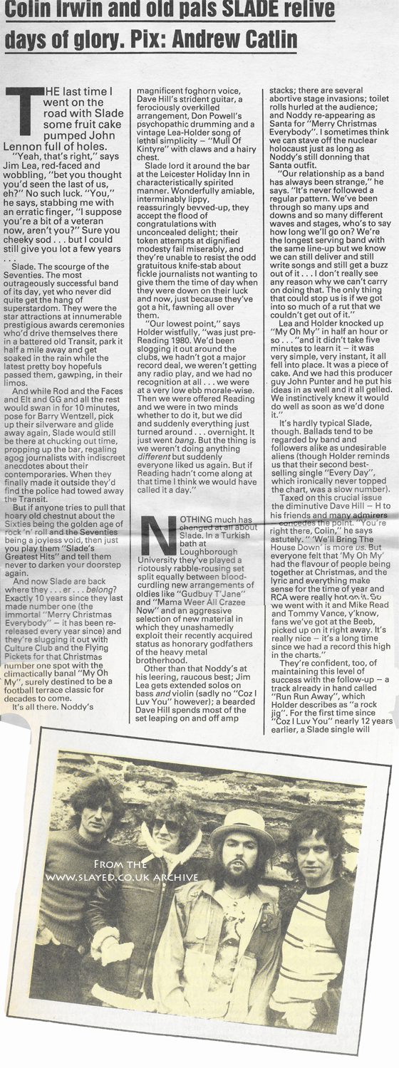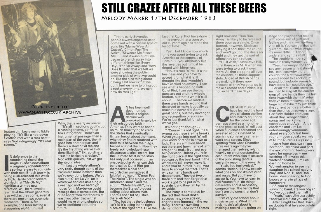 KERRANG! December 1983 When St. Noddy the Holder, that renowned Bishop of Bludgeon, fmally elects to trade in his multi-storey, stackheeled pulpit for a slow-burning log fire, bungalow-level carpet slippers and a Barbara Cartland novel (ah. the quiet life!), hell doubtless snuggle under his duvet (complete with Wee Willie Winkle night cap) having first offered praise to his 'Lordy Lordy' for creating Quiet Riot ('And on the eighth day .. .') Now, cum, on, the reason's obvious! The Los Angeles quartet recently blasted into the US Top Five with their version of that klassic, 'Cum On Feel The Noize' (or in Phil Mogg's case, 'Cum On Feel The Noze'), thereby awakening a whole generation of sibling Yanks to the pleasures of etymological contortion, and at the same time ensuring a steady flow of offshore bucks into the Slade reservoir. Bank managers, stockbrokers and hotel doormen now eagerly rush to call Holder 'sir', as they assiduously pump his flesh (to use a political hustings term) and feel his newly bulging wallet. If the 'silent' hell raisers from LA are the fast-food 'rocky burger' taste of the moment then Slade have undoubtedly helped light the flame that makes 'em so hot! For not only have QR struck a rich precious Meta1 vein with 'Cum On Feel The Noize', they've done it in a manner so like the Wolverhampton wacky racers - a case of Mike Yarwood and Harold Wilson! “It's a good version of the song. I don't think Quiet Riot have added anything to the original, but they've updated the sound." Noddy Holder looks professionally relaxed (everything Slade do has that air of the old pro' about it) as he contemplates higher things (a full can of lager stuck on a very tall shelf) whilst lounging across his publicist's couch. "We've actually been approached in the recent past by people wanting us to update one of our classics. But, not even seeing what a band like Quiet Riot have done so successfully with modern studio technology on an old Slade tune has persuaded us it's worth doing. There was a spontaneity and electricity about the numbers when we first did 'em that could never be recaptured now. There just wouldn't be the same feel so, no matter how much money is offered, we're not into prostituting our own heritage." Of course, why should Slade bother revisiting past glories, when QR are doing it for them? Rumour (unsubstantiated at present) has it that 'Mama We're All Crazee Now' and/or 'Gudbye T’Jane’ might well crop up on the stripe-happy lads' next album. So, there's every possibility that the Slade back catalogue will become legitimate plunder fodder for a host of American hard rock pirates (possessed of a sheep mentality) looking for healthy chart pickings. The irony of it is that Holder's heroes are presently without a US recording deal ("we're hoping to clinch one soon") and have always been regarded as too parochially British to rock 'em dead on the transatlantic route. But, in Britain during the early Seventies, Slade could boast more hits than any assassination squad. However, being in the pop business is rather like playing the fruit machines. You can get a run of luck when every coin triggers a jackpot, then inexplicably the winnings just dry up. There's no obvious logic to either streak and Slade have been stuck in the latter groove for some years, releasing a torrent of strong stuff that's scarcely dented the charts. Until now, that is, cos it's 'flame-on' time again as 'My Oh My' has burnt a cinder trail up the Top 20. A ballad in the tradition of 'Everyday' and 'C'est La Vie', this song sways with an almost waltz-style rhythm (a case of 'We'll Bring The Strauss Down'?) yet retains a north-face- of-the-Eiger (i.e. very rocky) foundation - balls to the waltz?? What sets it up as different from anything Slade have ever attempted before is the neotechnological sound gained by producer John Punter. "It was RCA's idea to get him in. They asked us to write a couple of songs specifically for singles release. So we recorded demos of two numbers, 'My Oh My' and 'Run Runaway'. When the label heard them, they flipped and thought the songs were great, but ... they insisted we get in an outside producer to do the final versions. To be frank, we thought the demos themselves were good enough to put out, however the success of 'My Oh My' suggests RCA were right. Working with an outside producer for the first time in, well, years (all recent Slade vinyl has been self-produced) was certainly interesting. It provided us with a fifth pair of ears and a new outlook in the studio. John was easy to work with in the end cos he was prepared to work with us rather than trying to dictate to us. And it was enlightening to actually do things in a slightly different manner to our norm, We built the sound of each instrument layer by layer with Punter rather than just putting down all the basic tracks in one go and then overdubbing," The thought might traverse a few minds that Slade were almost pressurised into using an outside producer by RCA. Indeed, given the fact that there's been a virtual Stalin-style purge recently of the label's comradely heavy rock roster (R.I.P Hawkwind, Alkatrazz, Budgie among others), were Slade in any danger of a concrete handshake? Whether or not 'My Oh My' is the birth of something big, we'll be able to judge when 'Run Runaway' ("a heavy jig") comes out in January. And that might well be the final song Punter records with Slade. The album is strangely titled 'The Amazing Kamikaze Syndrome'. Now, with some bands, a monicker like that would immediately throw up an explanatory comment like: 'Oh, it was inspired by an obscure Herman Hesse novel/a long-lost episode of 'The Prisoner”/a rare Salvador Dali portrait (delete where applicable). So, which is it, Nod? Could it be that Noddy Holder is a budding Freudian figure in the rock hierarchy? Psychological woargh-fare lives, head for the couch! Still, at least the above explanation will allay lascivious rumours that 'The Am